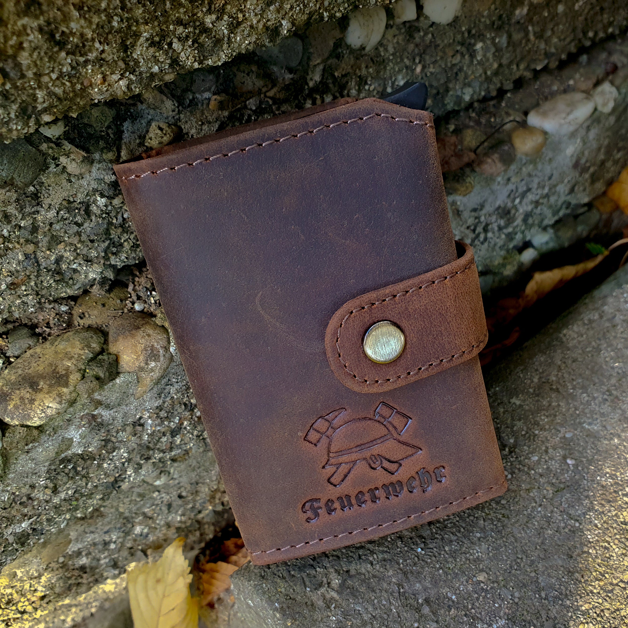 Feuerwehr Leder Kartenetui Geldbeutel mit RFID-Schutz, braun mit Helm u. Axt